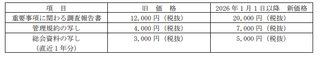 重要事項に係る調査報告書発行に関わる価格改定について
